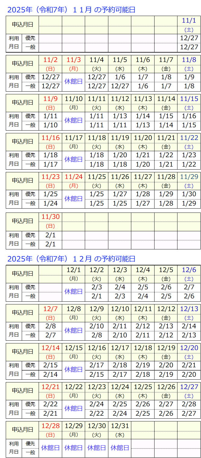 9時に窓口に来た方で利用希望日、利用区分、施設が重複する場合は、希望者どうしでくじ引きを行ない、その順番で申込みを受付ます。