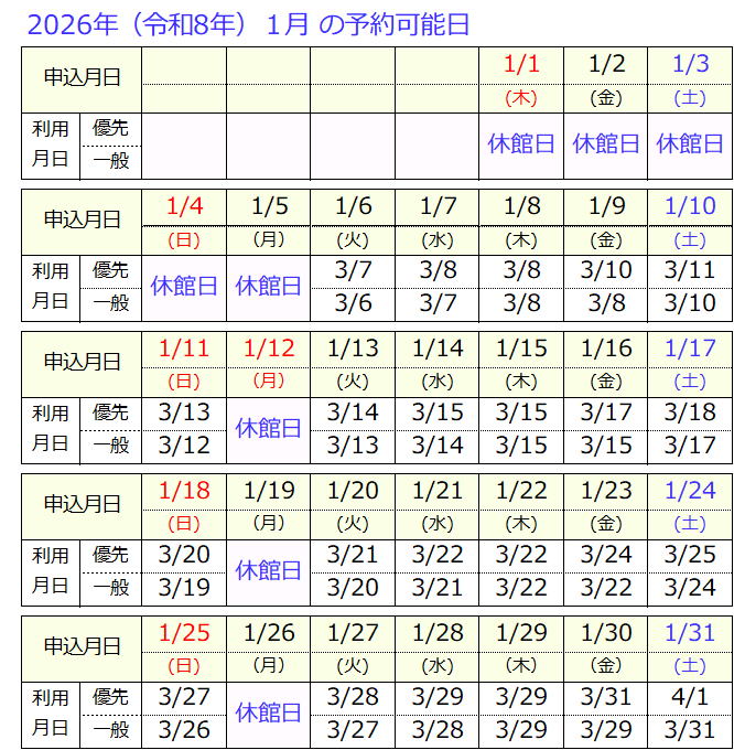 9時に窓口に来た方で利用希望日、利用区分、施設が重複する場合は、希望者どうしでくじ引きを行ない、その順番で申込みを受付ます。